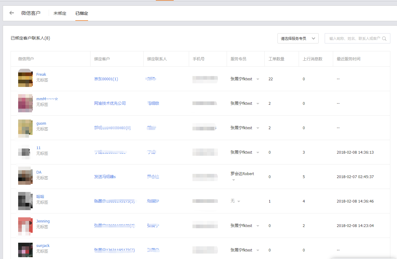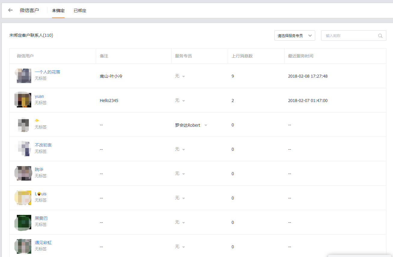 1、未绑定:指微信粉丝(外部联系人)关注了微信服务号,但还未与CRM客户和联系人绑定,可设置服务专员;