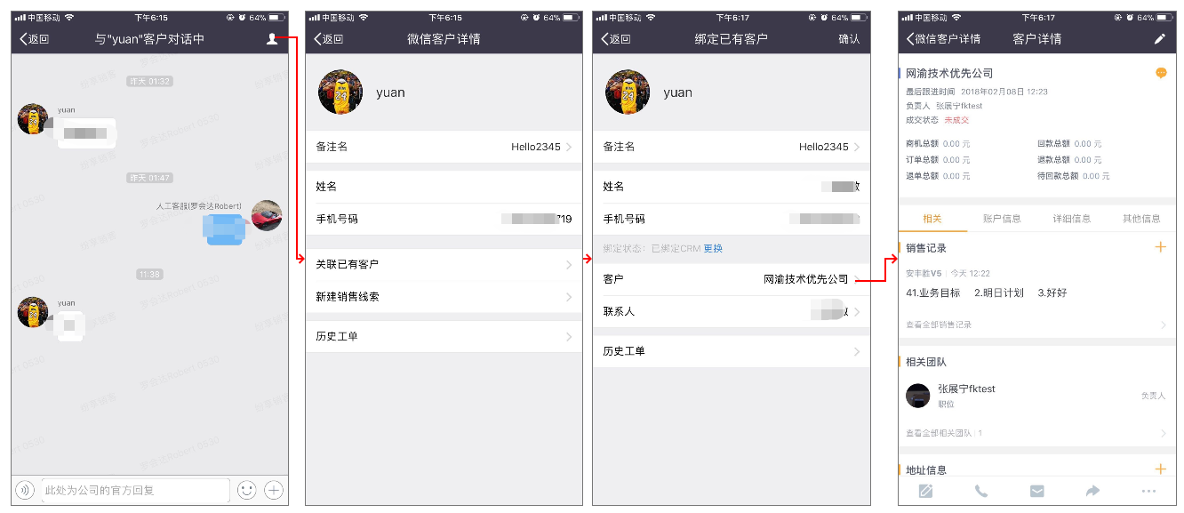 外部联系人在进行业务处理时,主动注册后,会自动转为CRM客户和联系记录,客服在对话中可以查看客户详情、关联CRM信息和历史工单,并且可以备注外部联系人信息。