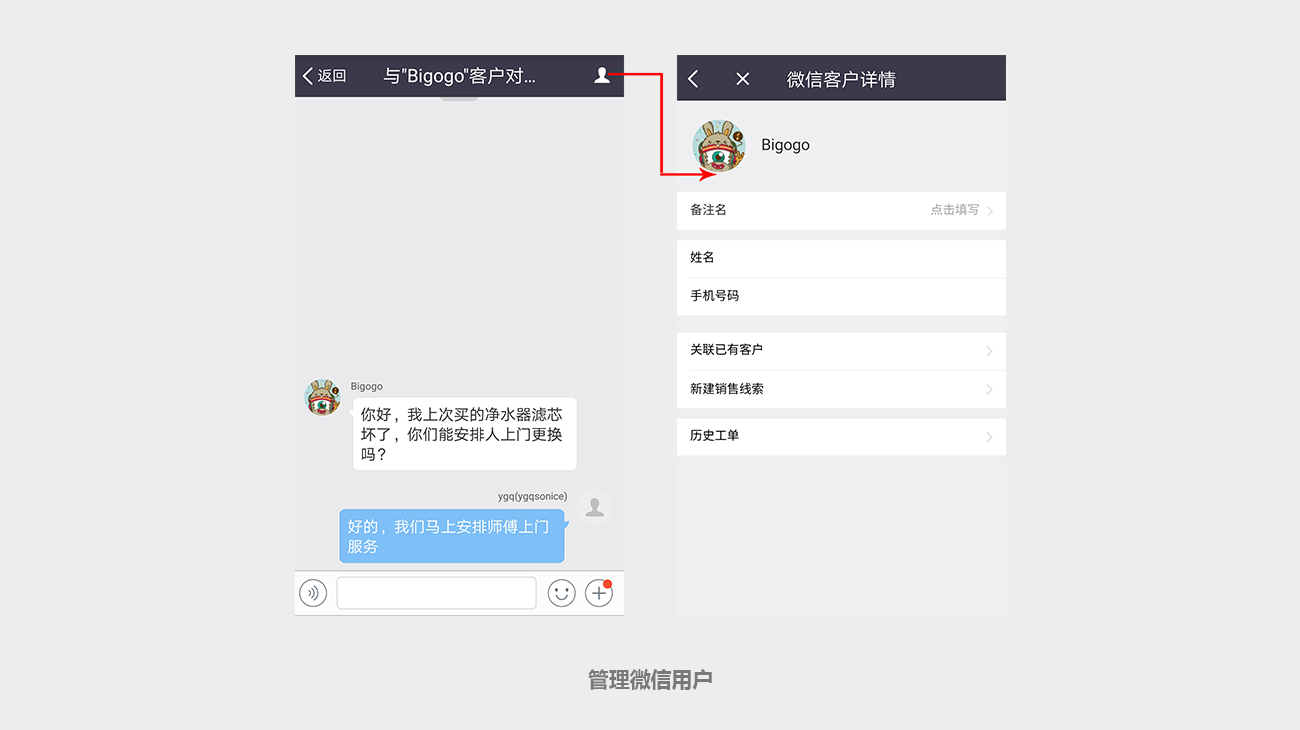 微信客服人员可以对微信用户(外部联系人)进行备注,点击微信用户(外部联系人)头像或者右上角icon可以查看用户基本信息和历史工单详情。
